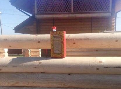 Мы использовали «Грунтовочное масло. Антисептик «Живица», который содержит льняное масло, скипидар живичный, деготь, сосновую смолу и сиккатив (без свинца).