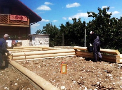 На фото сруб, который возводится в данный момент под Анапой - месте, как считают многие, не лучшем для подобных строений из-за высокой влажности. Особенность технологии, применяемой бригадой специалистов - пропитка межвенцовой части (т.е. продольной стороны бревна) в процессе сбора сруба. Таким образом, бревно обрабатывается со всех сторон, что позволяет избежать возникновения проблем «изнутри».