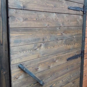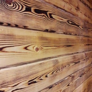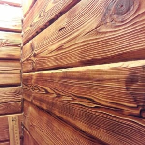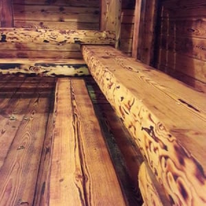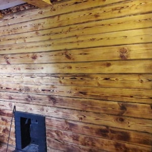 Например, баня на фото отделана обожжённой и брашированной сосной и покрыта «Грунтовочным маслом», а также «Маслом для бань и саун» в 2 слоя. При покраске балок и двери для большей выразительности был добавлен колер К-76 «Каштан».