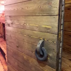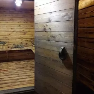 Например, баня на фото отделана обожжённой и брашированной сосной и покрыта «Грунтовочным маслом», а также «Маслом для бань и саун» в 2 слоя. При покраске балок и двери для большей выразительности был добавлен колер К-76 «Каштан».